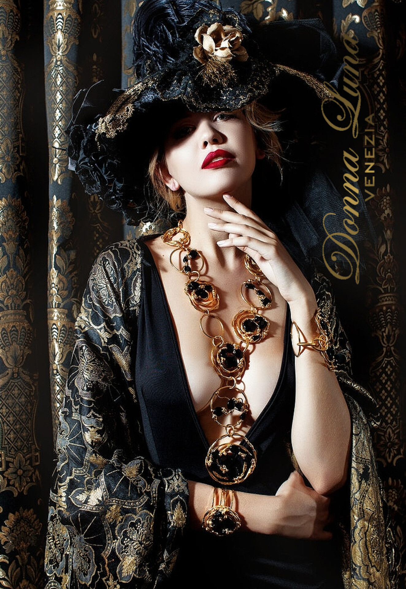 Ювелирный брэнд «Donna Luna VeneZia» любит экспериментировать со стилями и широко применяет в своих творениях античные, египетские, персидские мотивы, пользуясь методом гальванизации и отдавая предпочтение благородным металлам, таким как серебро и золото, но в коллекции имеется также изделия из алхимических сплавов, и конечно же камни: они могут быть самыми разнообразными: от драгоценных до полудрагоценных ...
